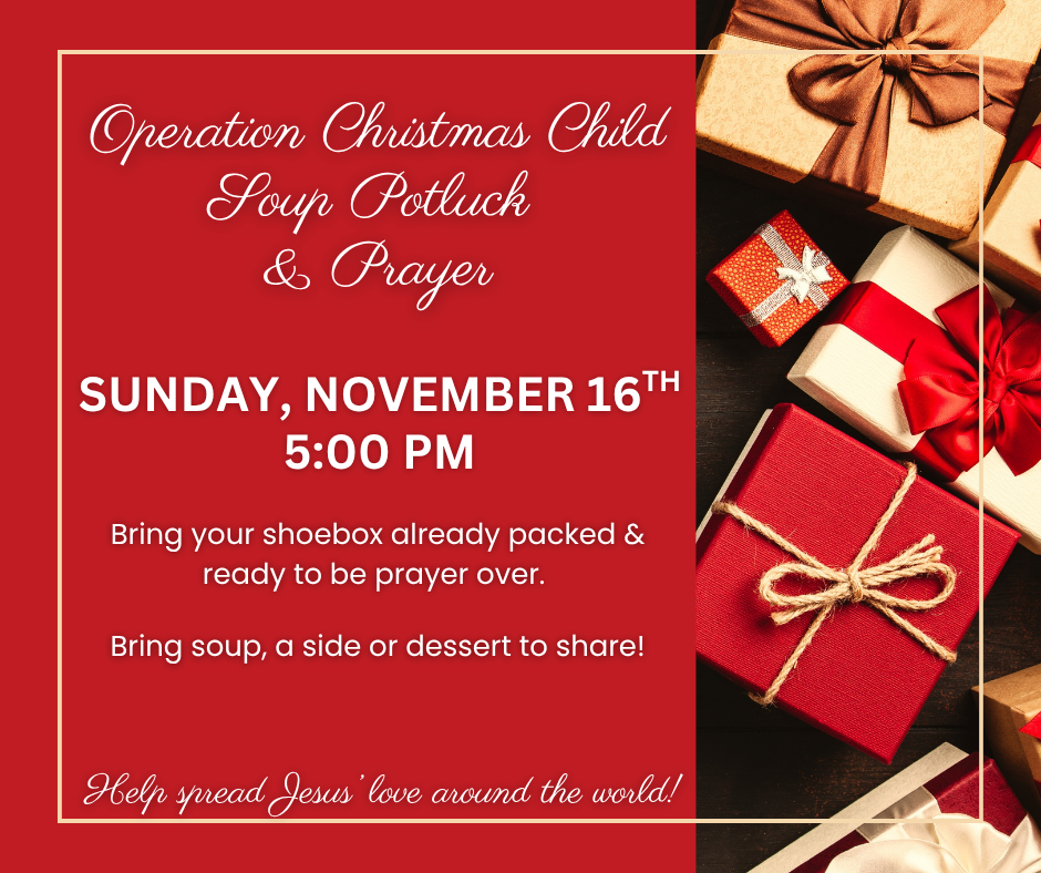 - Operation Christmas Child Soup Potluck | Sunday, November 16th @ 5:00pm
