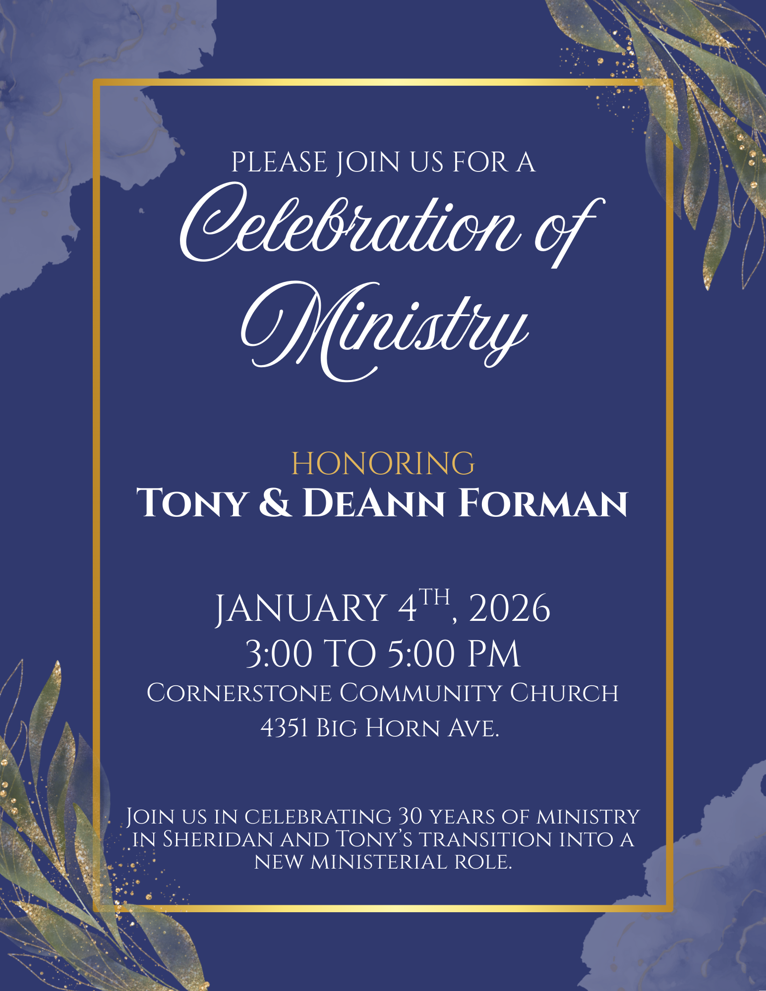 - Celebration of Ministry for Tony & DeAnn Forman | January 4th from 3-5pm.